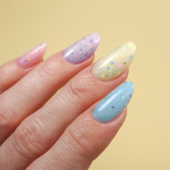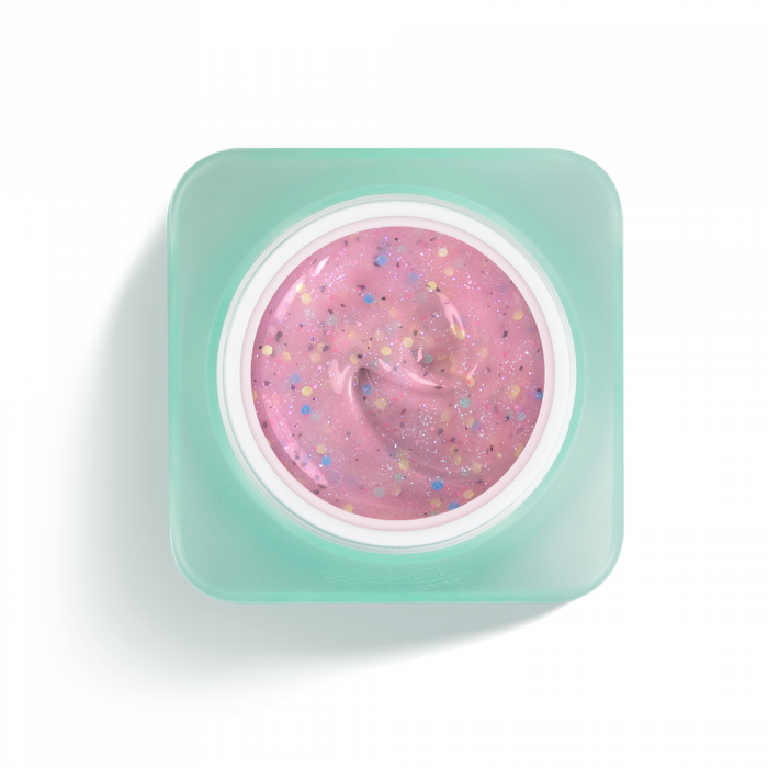 Stavebný gél s pastelovo ružovým základom, ktorý obsahuje dekoratívne plátky rôznych veľkostí a farieb a biele trblietky. Ide o stredne hustý, samonivelačný gél, ktorý netečie, ale pekne sa rozlieva, čím výrazne zrýchľuje prácu v salóne.